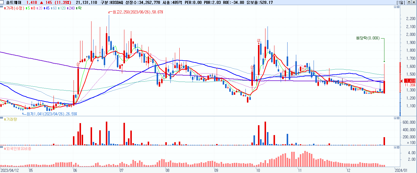 - 솔트웨어 (1,418원 ▲ 11.39% , 시총: 486억, 거래량: 21,273,845, 거래대금:316억)