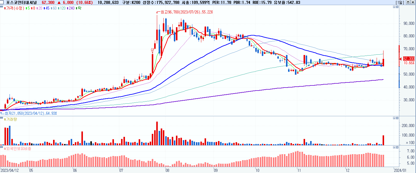 - 포스코인터내셔널 (62,300원 ▲ 10.66% , 시총: 109,600억, 거래량: 10,395,130, 거래대금:6,714억)