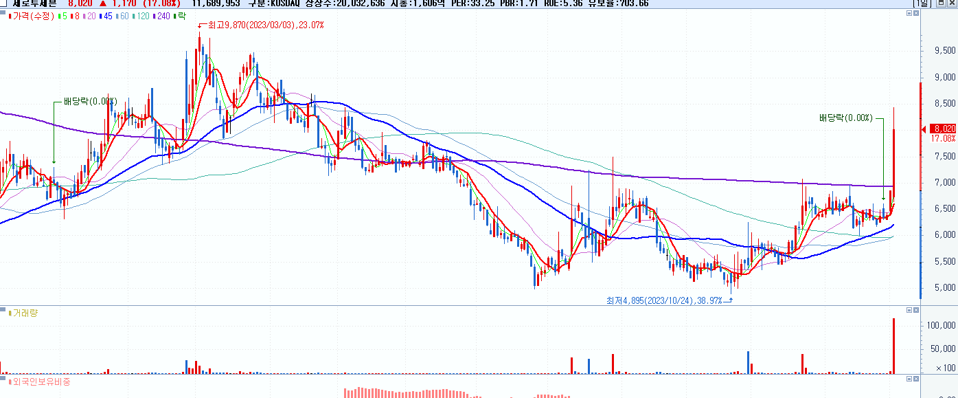 - 제로투세븐 (8,020원 ▲ 17.08% , 시총: 1,607억, 거래량: 11,689,953, 거래대금:917억)