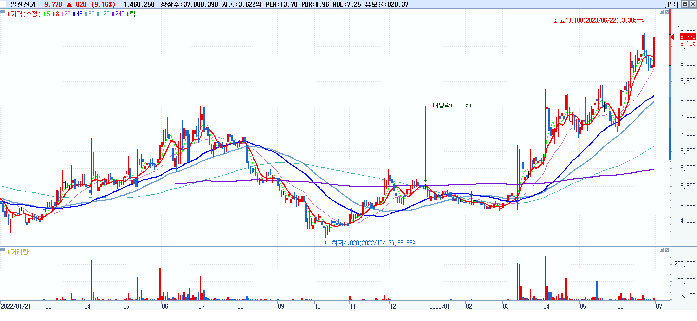'일진전기' 52주 신고가 경신, 기관 6일 연속 순매수(8.8만주)