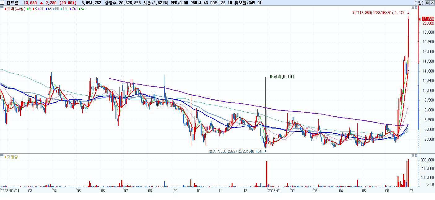 시총: 1,316억 거래량: 11,254,730 거래대금:298억