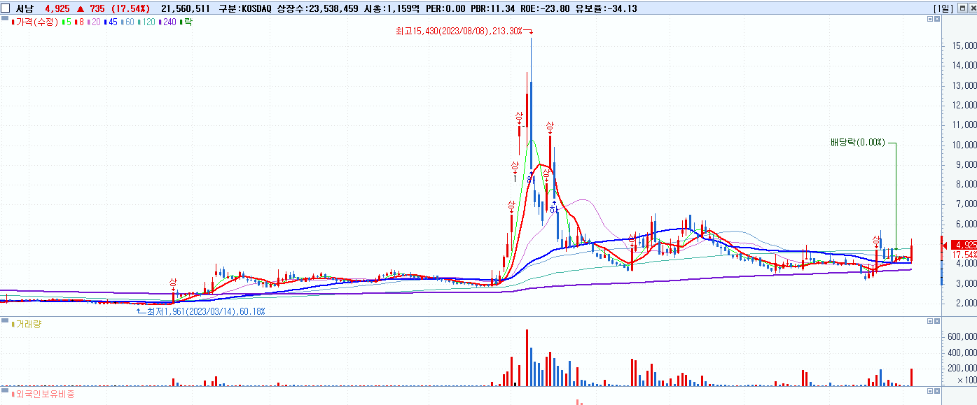 - 서남 (4,925원 ▲ 17.54% , 시총: 1,159억, 거래량: 21,655,916, 거래대금:1,045억)