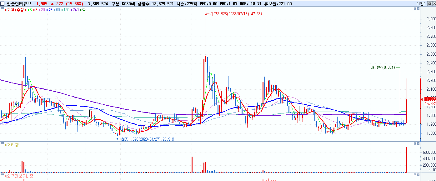 - 한솔인티큐브 (1,985원 ▲ 15.88% , 시총: 276억, 거래량: 7,598,100, 거래대금:160억)