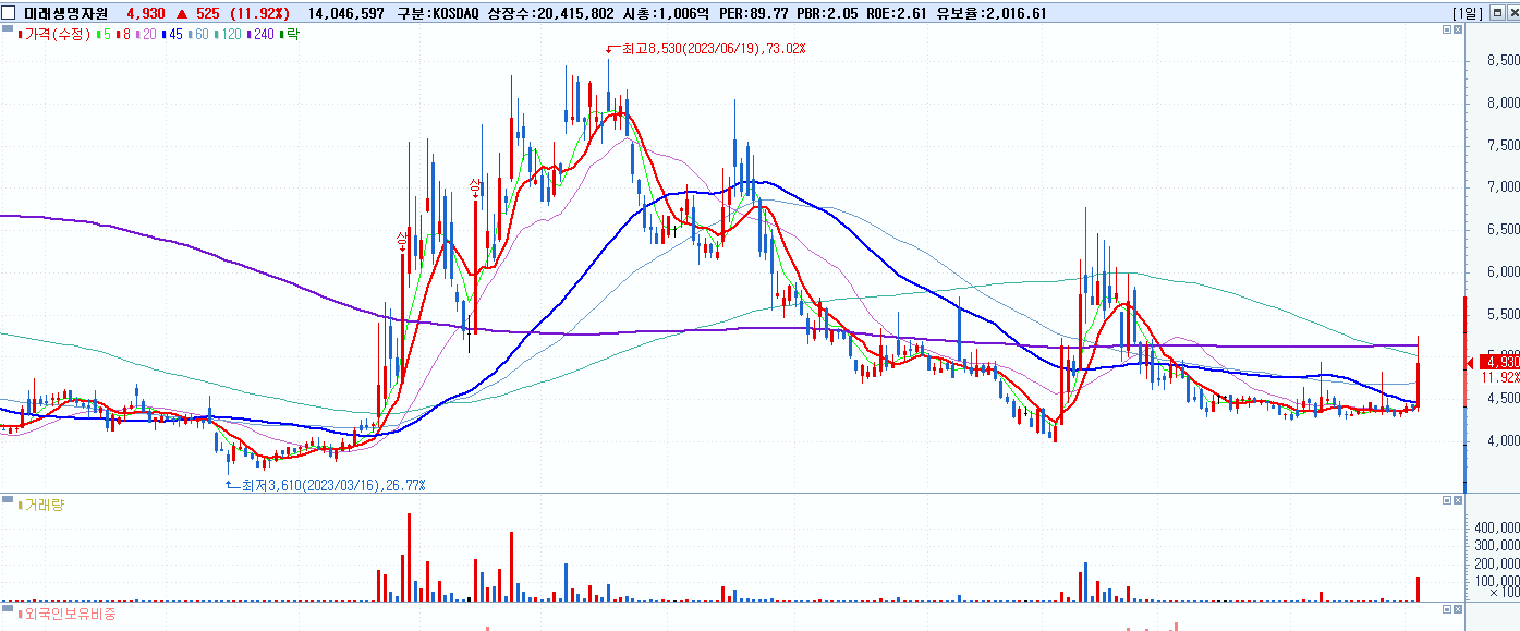 - 미래생명자원 (4,930원 ▲ 11.92% , 시총: 1,006억, 거래량: 14,076,385, 거래대금:698억)