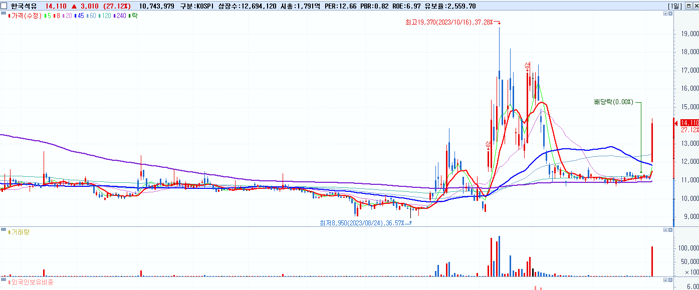 - 한국석유 (14,110원 ▲ 27.12% , 시총: 1,791억, 거래량: 10,797,533, 거래대금:1,475억)