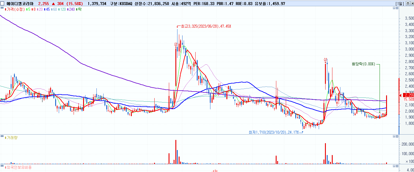 - 에이디엠코리아 (2,255원 ▲ 15.58% , 시총: 492억, 거래량: 1,386,439, 거래대금:30억)