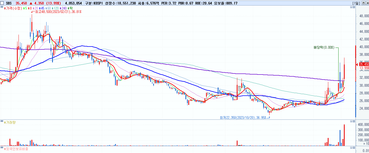 - SBS (35,450원 ▲ 13.99% , 시총: 6,576억, 거래량: 4,127,786, 거래대금:1,414억)