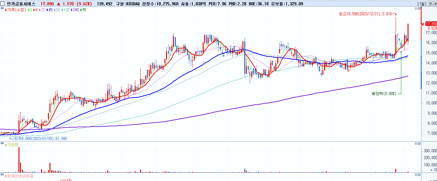 - 인카금융서비스 (17,890원 ▲ 9.62% , 시총: 1,838억, 거래량: 139,581, 거래대금:24억)
