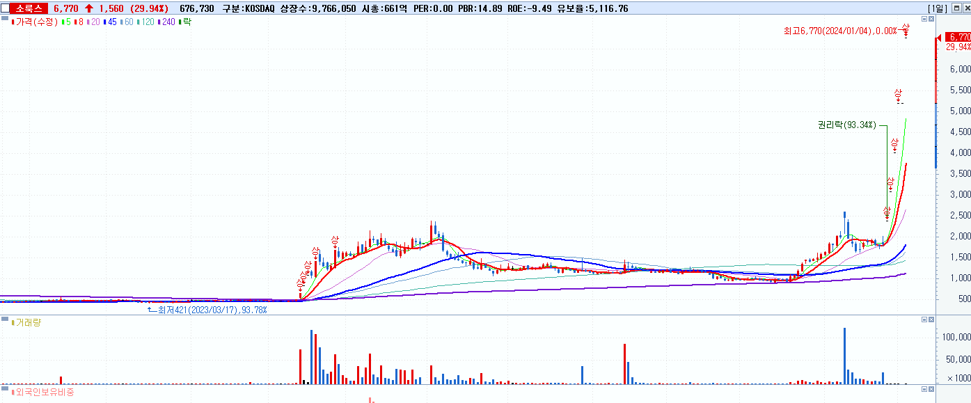 - 소룩스 (6,770원 ▲ 29.94% , 시총: 661억, 거래량: 676,982, 거래대금:46억)