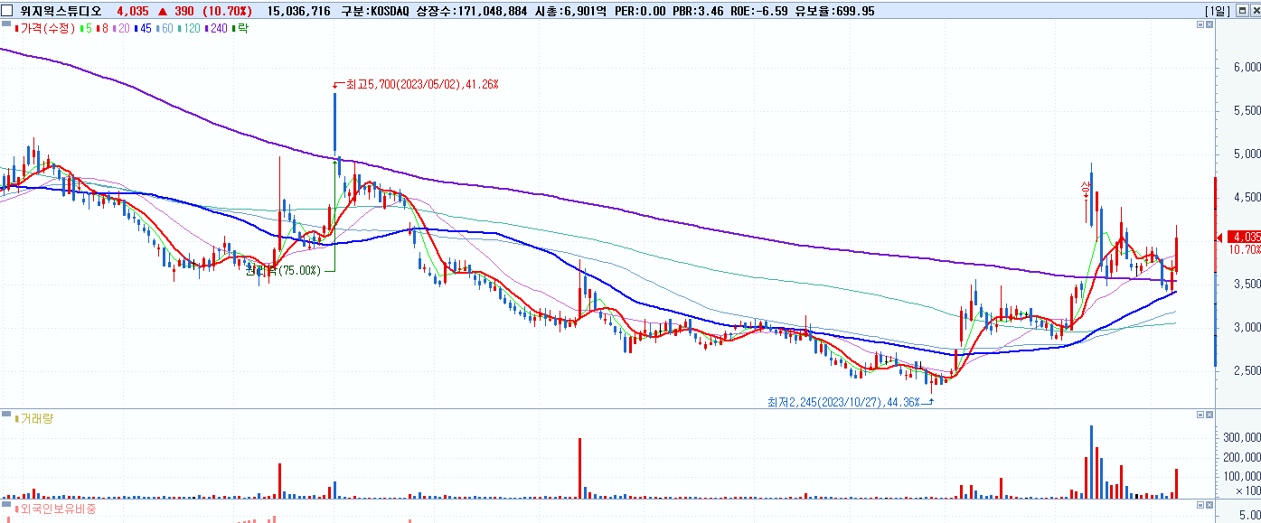 - 위지윅스튜디오 (4,035원 ▲ 10.7% , 시총: 6,902억, 거래량: 15,132,311, 거래대금:604억)