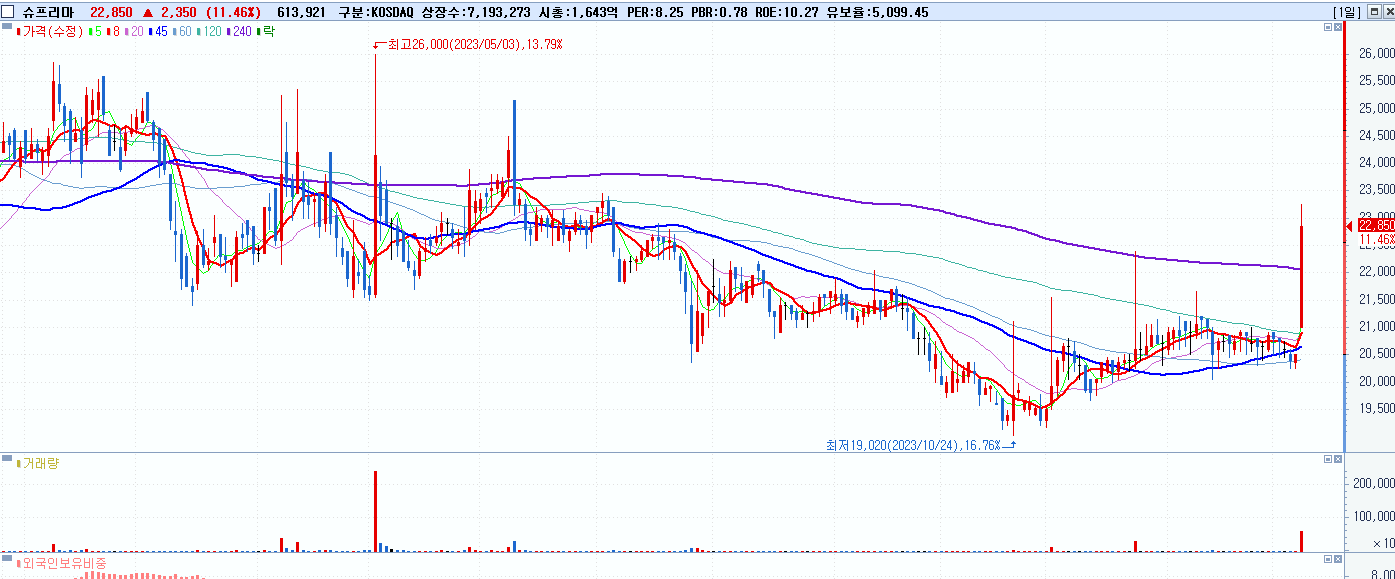- 슈프리마 (22,850원 ▲ 11.46% , 시총: 1,644억, 거래량: 614,465, 거래대금:137억)