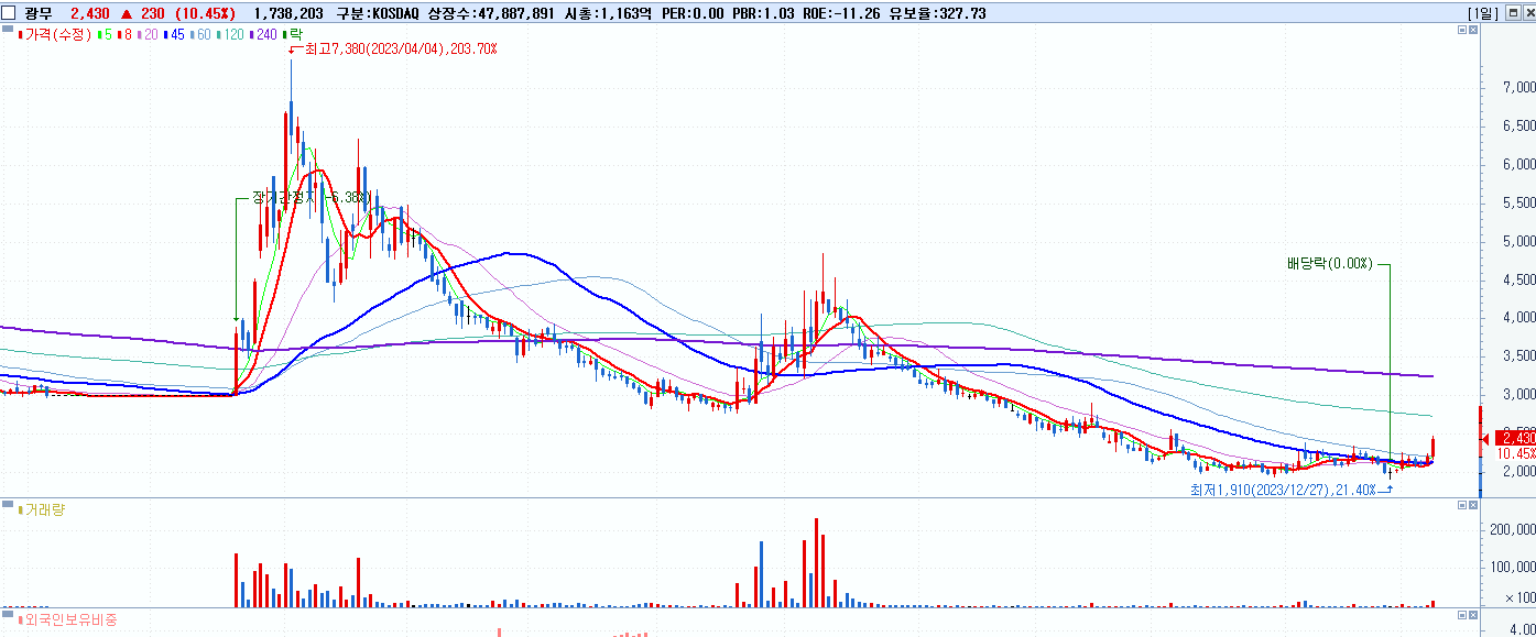 - 광무 (2,430원 ▲ 10.45% , 시총: 1,164억, 거래량: 1,744,551, 거래대금:41억)