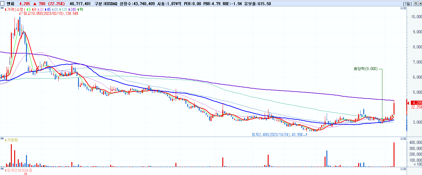 - 엔피 (4,285원 ▲ 22.25% , 시총: 1,874억, 거래량: 41,668,046, 거래대금:1,717억)