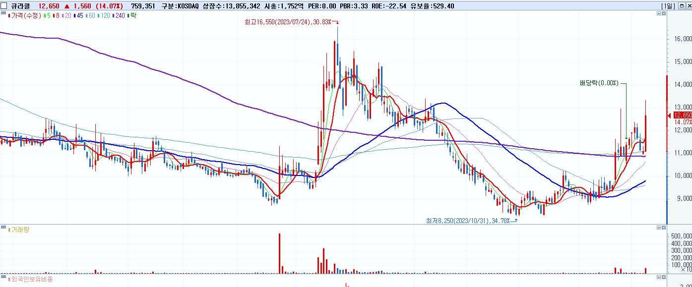 - 큐라클 (12,650원 ▲ 14.07% , 시총: 1,753억, 거래량: 760,112, 거래대금:95억)