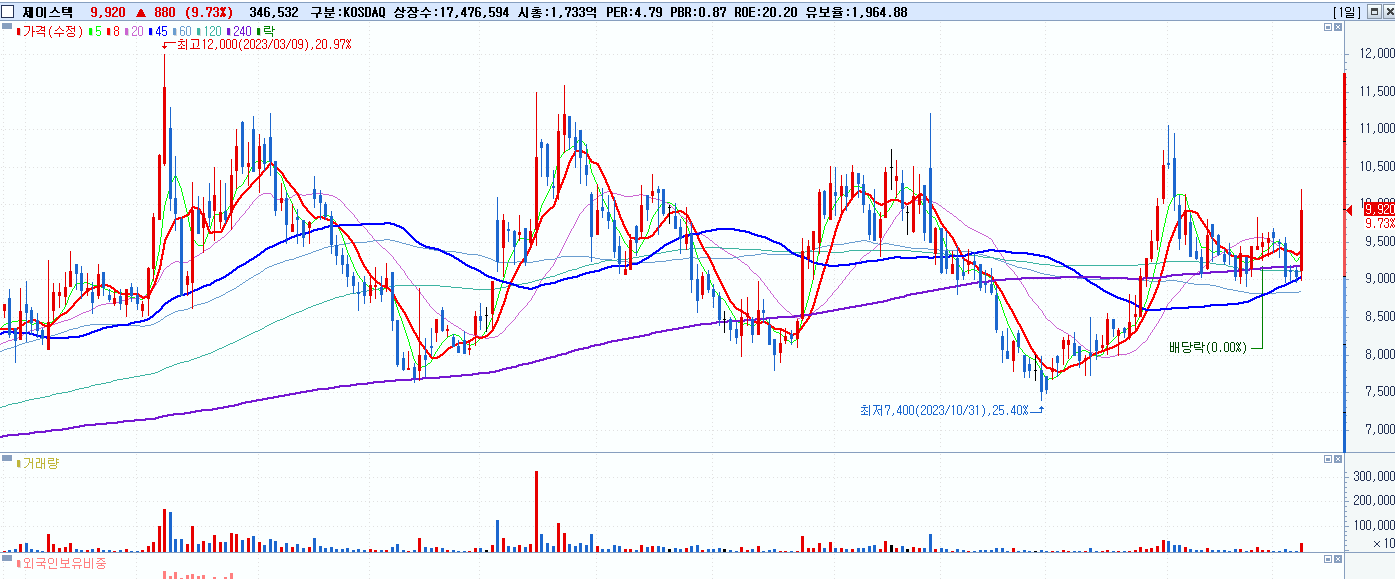 - 제이스텍 (9,920원 ▲ 9.73% , 시총: 1,734억, 거래량: 347,420, 거래대금:34억)