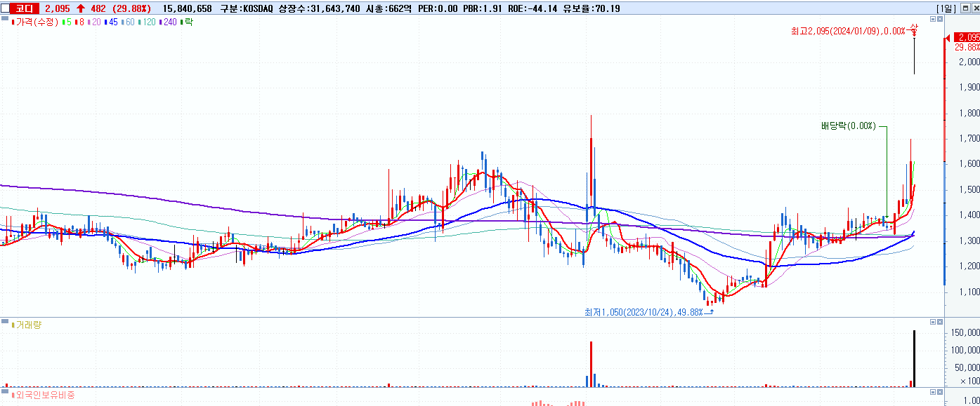 - 코디 (2,095원 ▲ 29.88% , 시총: 663억, 거래량: 15,840,673, 거래대금:329억)