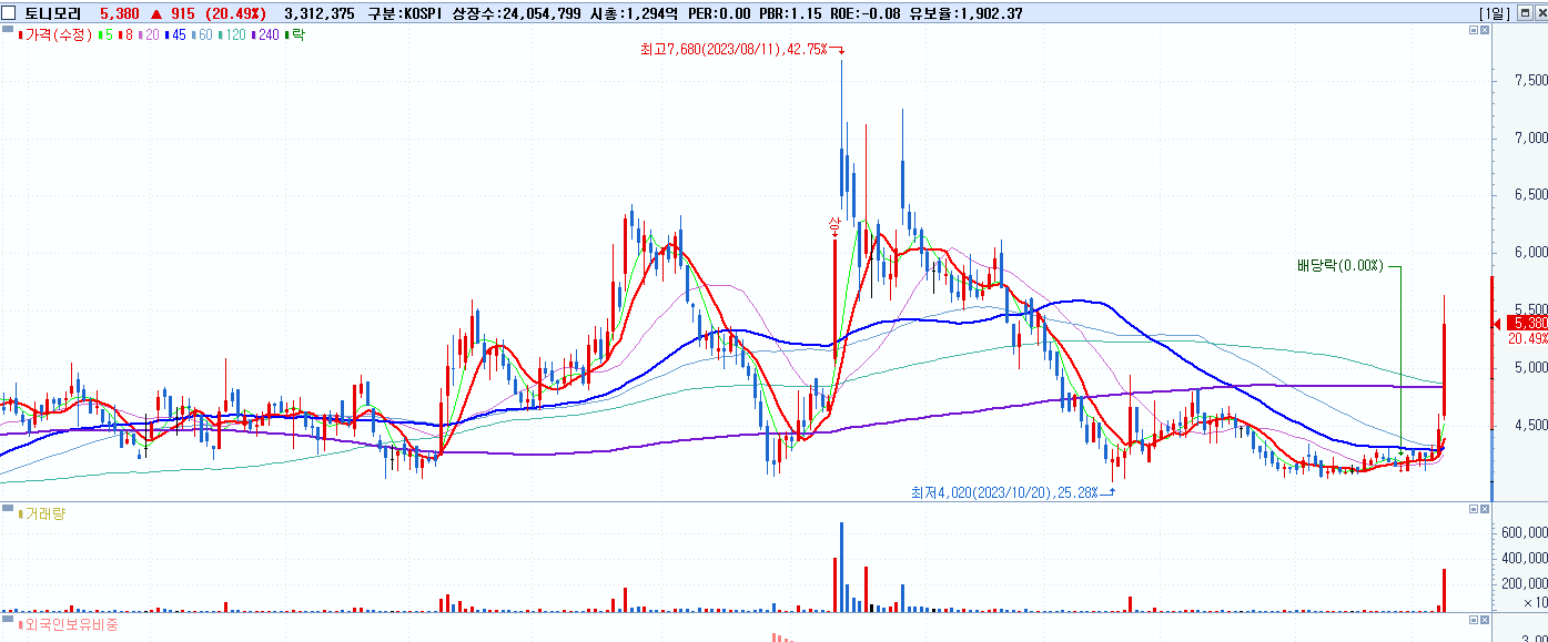 - 토니모리 (5,380원 ▲ 20.49% , 시총: 1,294억, 거래량: 3,320,995, 거래대금:172억)