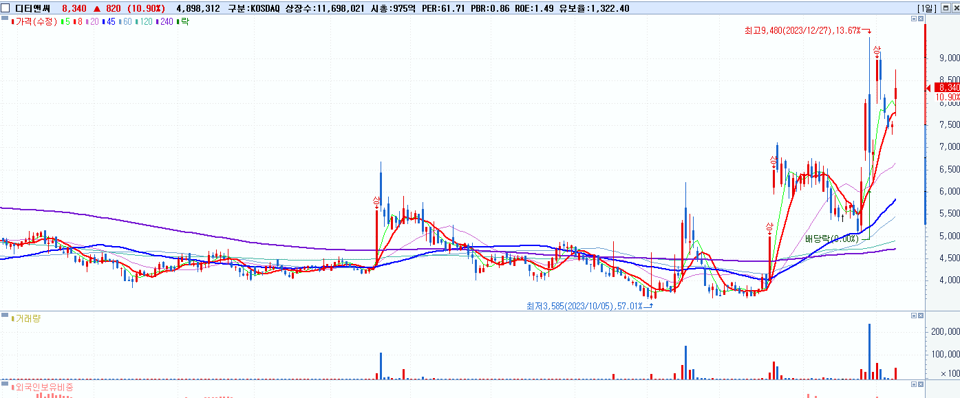 - 디티앤씨 (8,340원 ▲ 10.9% , 시총: 976억, 거래량: 4,912,096, 거래대금:407억)