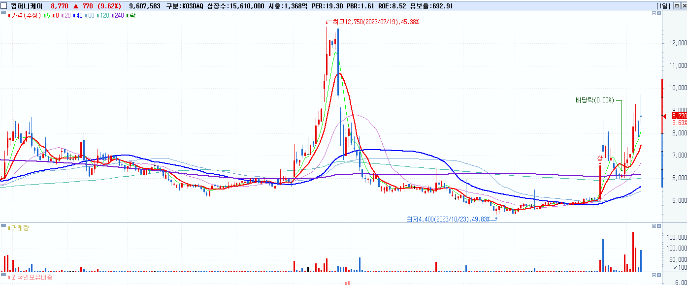 - 컴퍼니케이 (8,770원 ▲ 9.63% , 시총: 1,369억, 거래량: 9,625,008, 거래대금:879억)