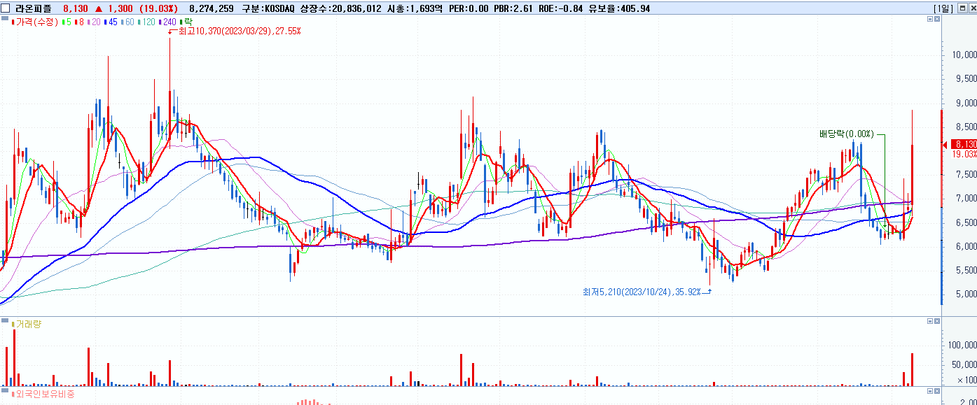 - 라온피플 (8,130원 ▲ 19.03% , 시총: 1,694억, 거래량: 8,426,713, 거래대금:694억)