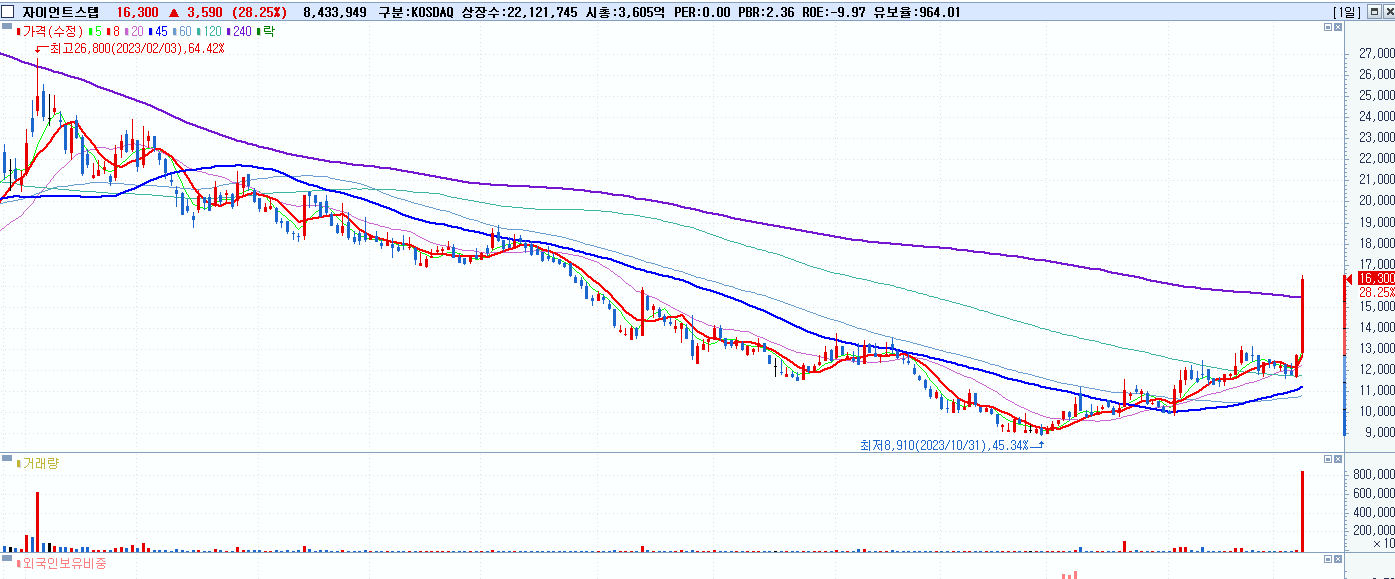 - 자이언트스텝 (16,300원 ▲ 28.25% , 시총: 3,606억, 거래량: 8,499,386, 거래대금:1,323억)