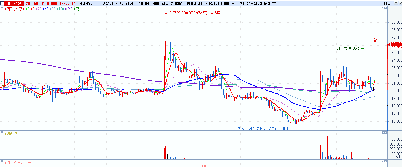 - 마크로젠 (26,150원 ▲ 29.78% , 시총: 2,835억, 거래량: 4,549,894, 거래대금:1,124억)