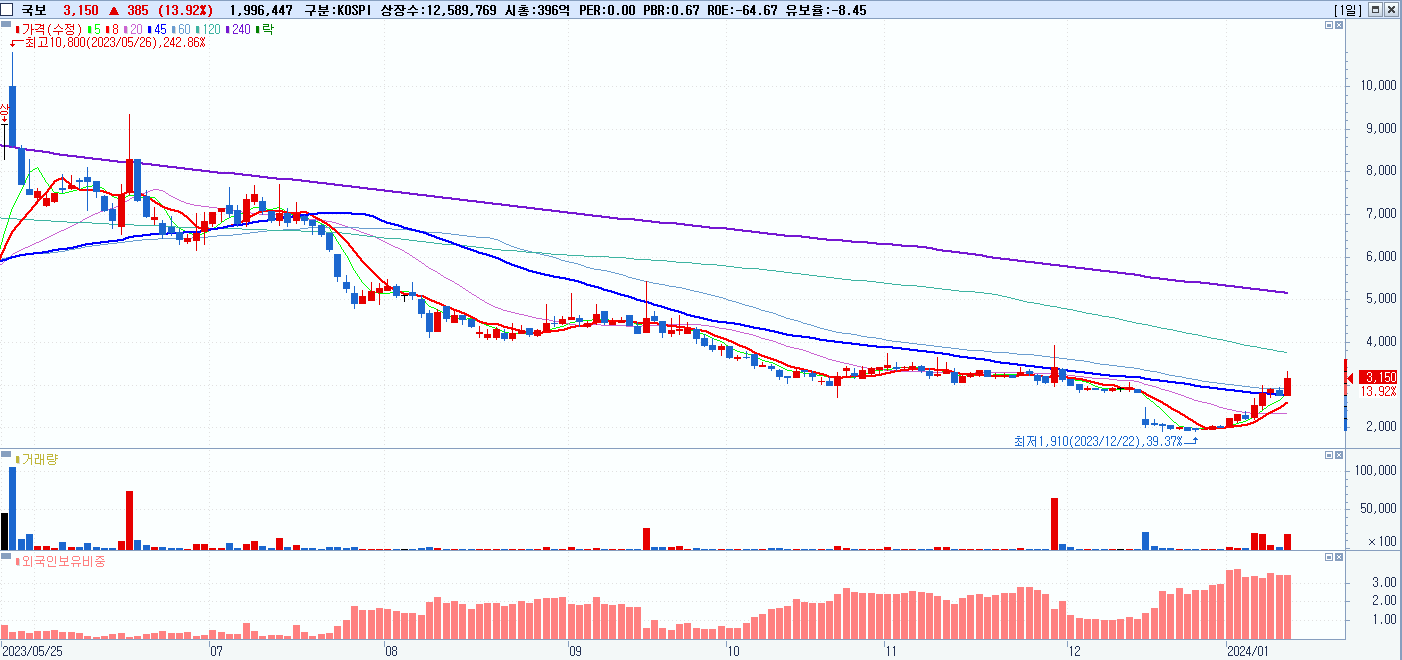 - 국보 (3,150원 ▲ 13.92% , 시총: 397억, 거래량: 2,030,440, 거래대금:63억)