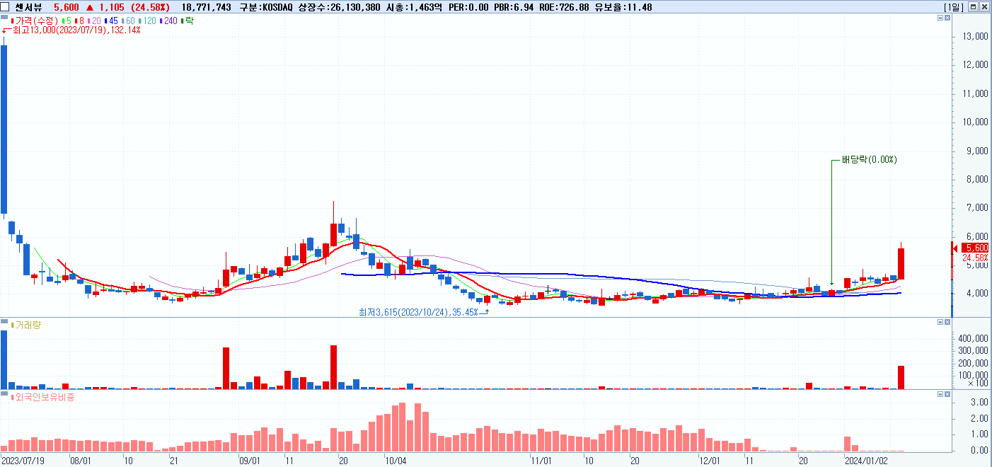 - 센서뷰 (5,600원 ▲ 24.58% , 시총: 1,463억, 거래량: 18,916,678, 거래대금:1,025억)