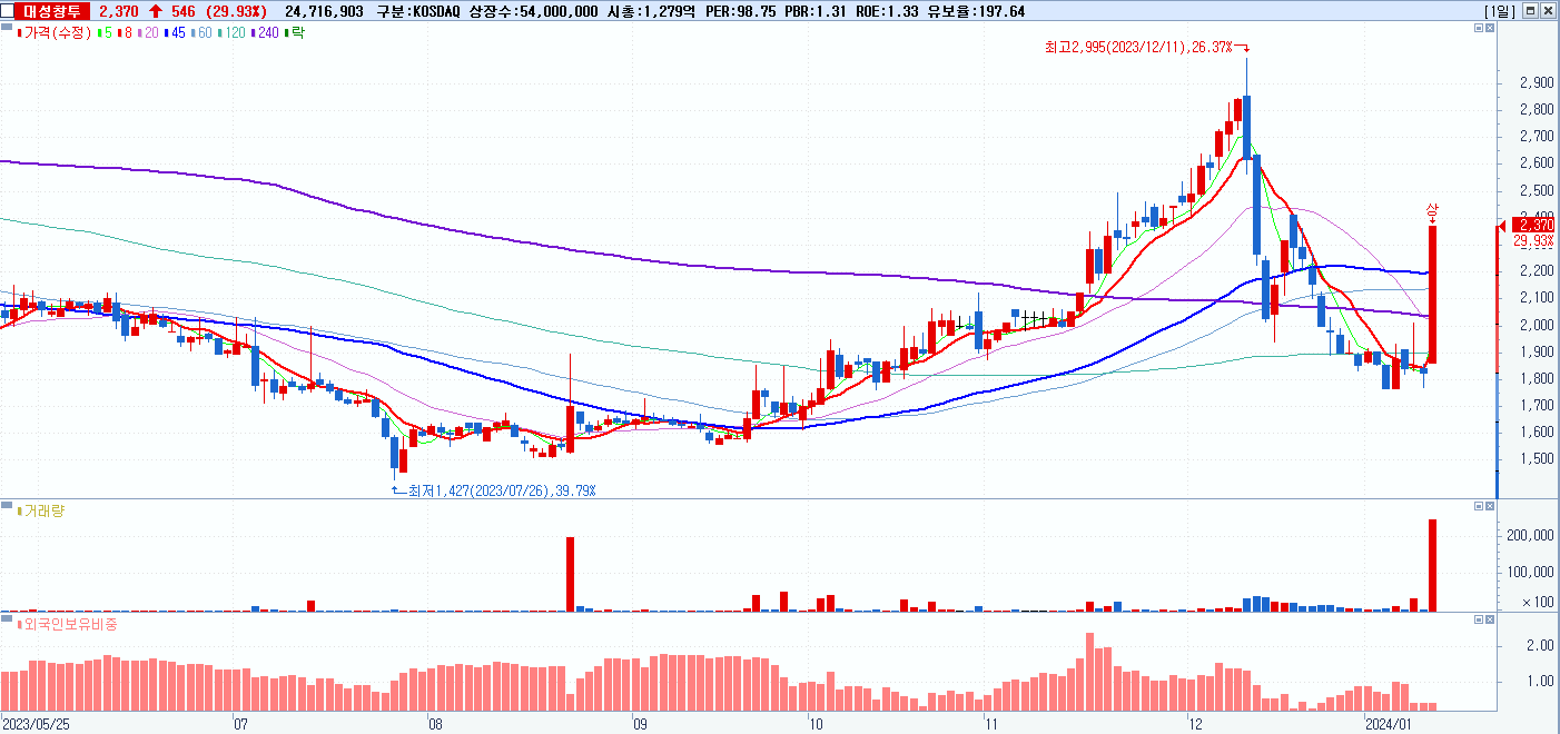 - 대성창투 (2,370원 ▲ 29.93% , 시총: 1,280억, 거래량: 24,795,861, 거래대금:542억)