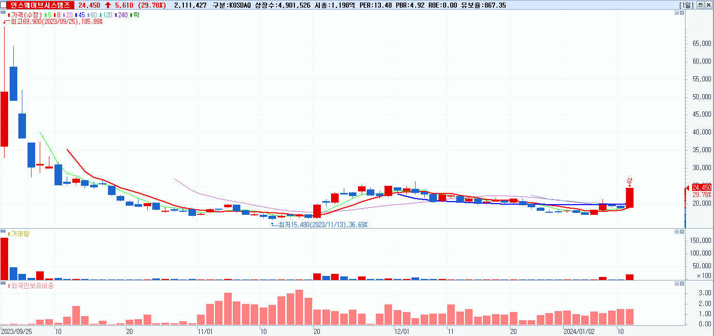 - 인스웨이브시스템즈 (24,450원 ▲ 29.78% , 시총: 1,198억, 거래량: 2,112,013, 거래대금:488억)
