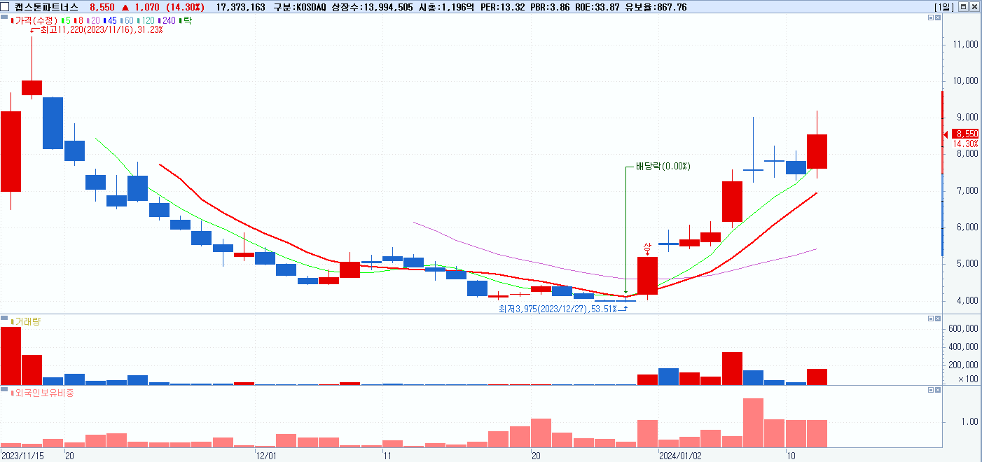 - 캡스톤파트너스 (8,550원 ▲ 14.3% , 시총: 1,197억, 거래량: 17,583,143, 거래대금:1,479억)
