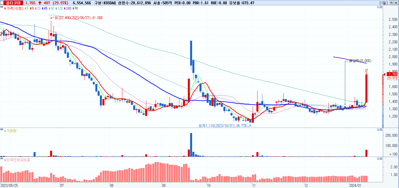 - 옵티코어 (1,765원 ▲ 29.97% , 시총: 505억, 거래량: 6,555,714, 거래대금:113억)
