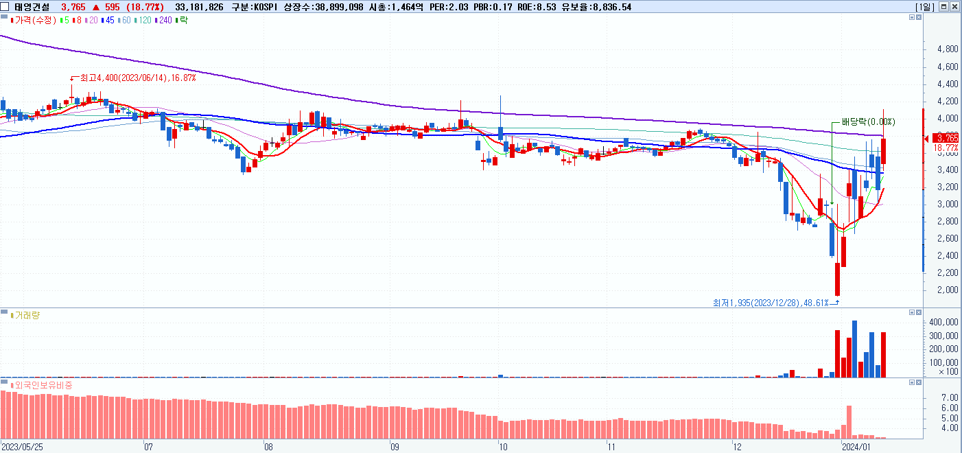 - 태영건설 (3,765원 ▲ 18.77% , 시총: 1,465억, 거래량: 33,489,676, 거래대금:1,270억)
