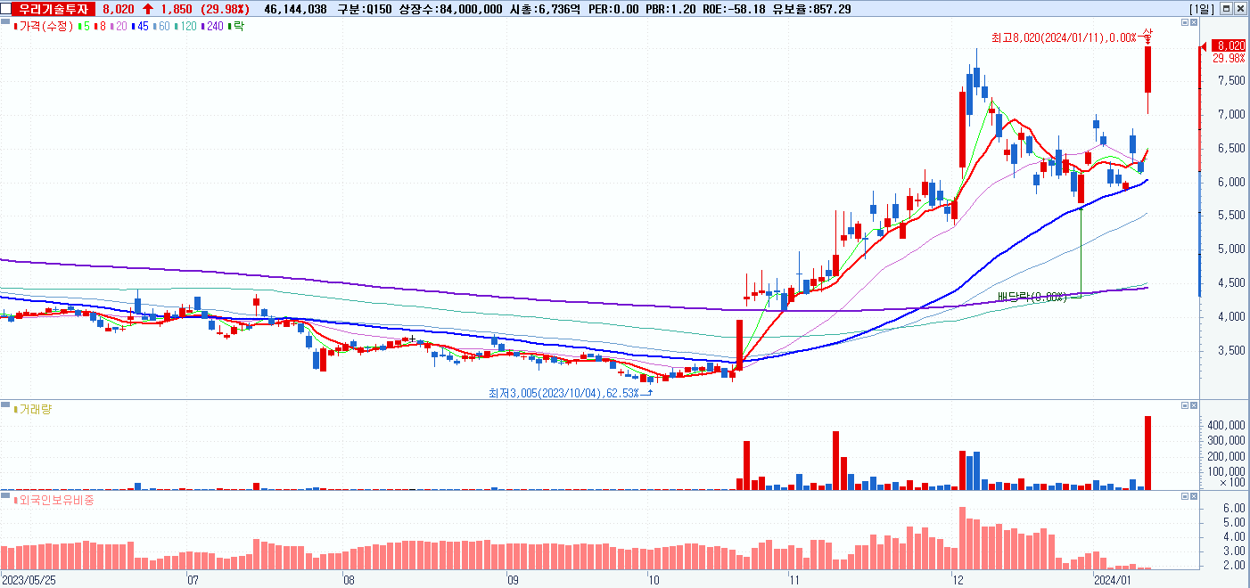 - 우리기술투자 (8,020원 ▲ 29.98% , 시총: 6,737억, 거래량: 46,147,470, 거래대금:3,560억)