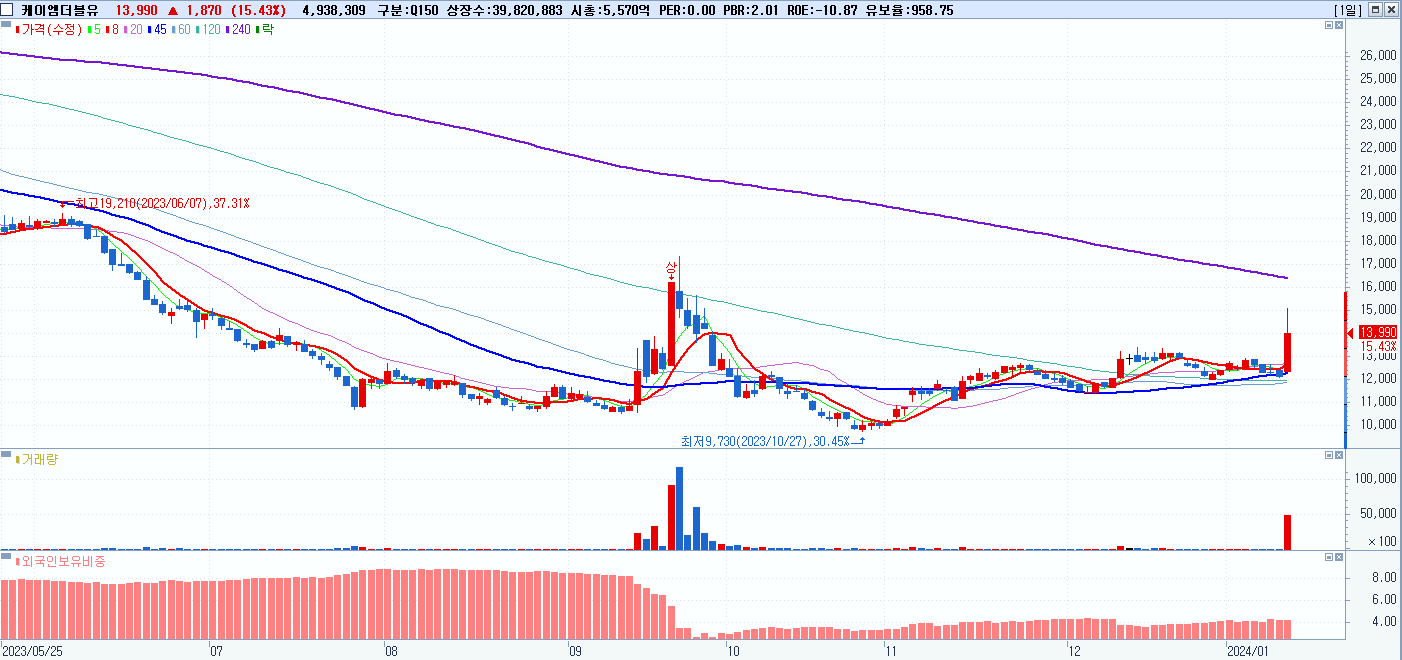 - 케이엠더블유 (13,990원 ▲ 15.43% , 시총: 5,571억, 거래량: 4,958,338, 거래대금:702억)