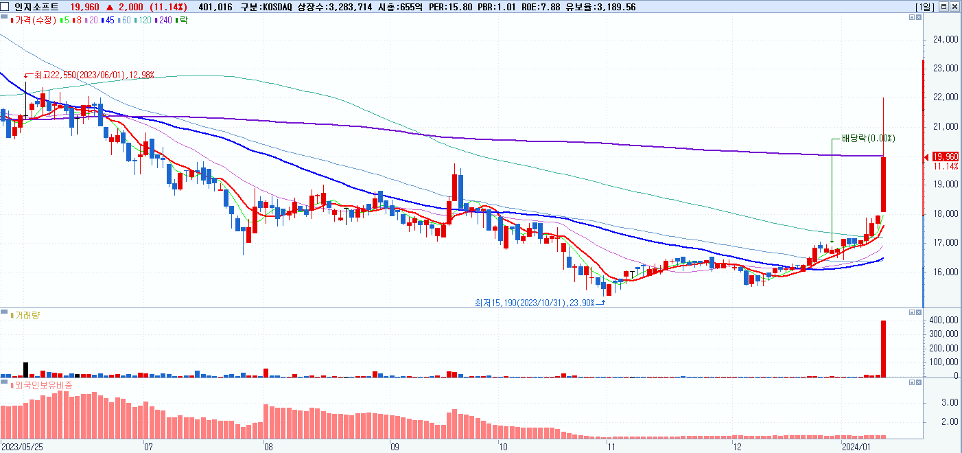 - 인지소프트 (19,960원 ▲ 11.14% , 시총: 655억, 거래량: 401,839, 거래대금:82억)