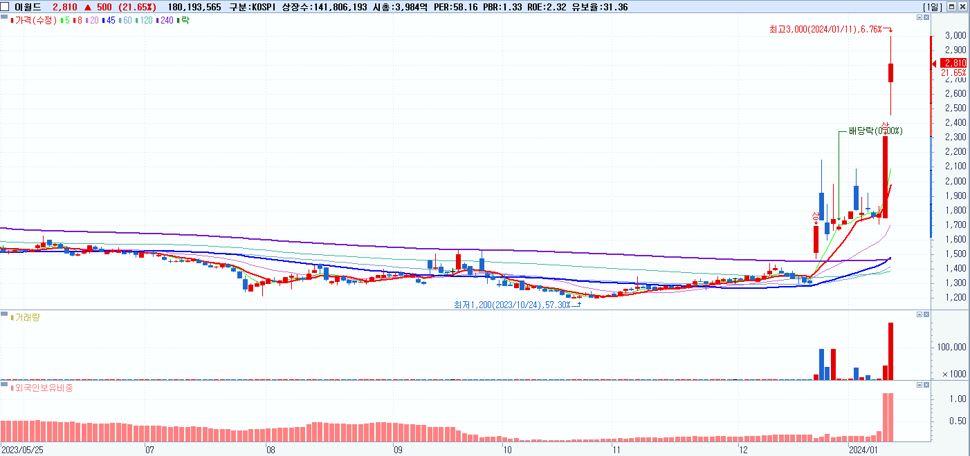 - 이월드 (2,810원 ▲ 21.65% , 시총: 3,985억, 거래량: 181,706,471, 거래대금:4,976억)