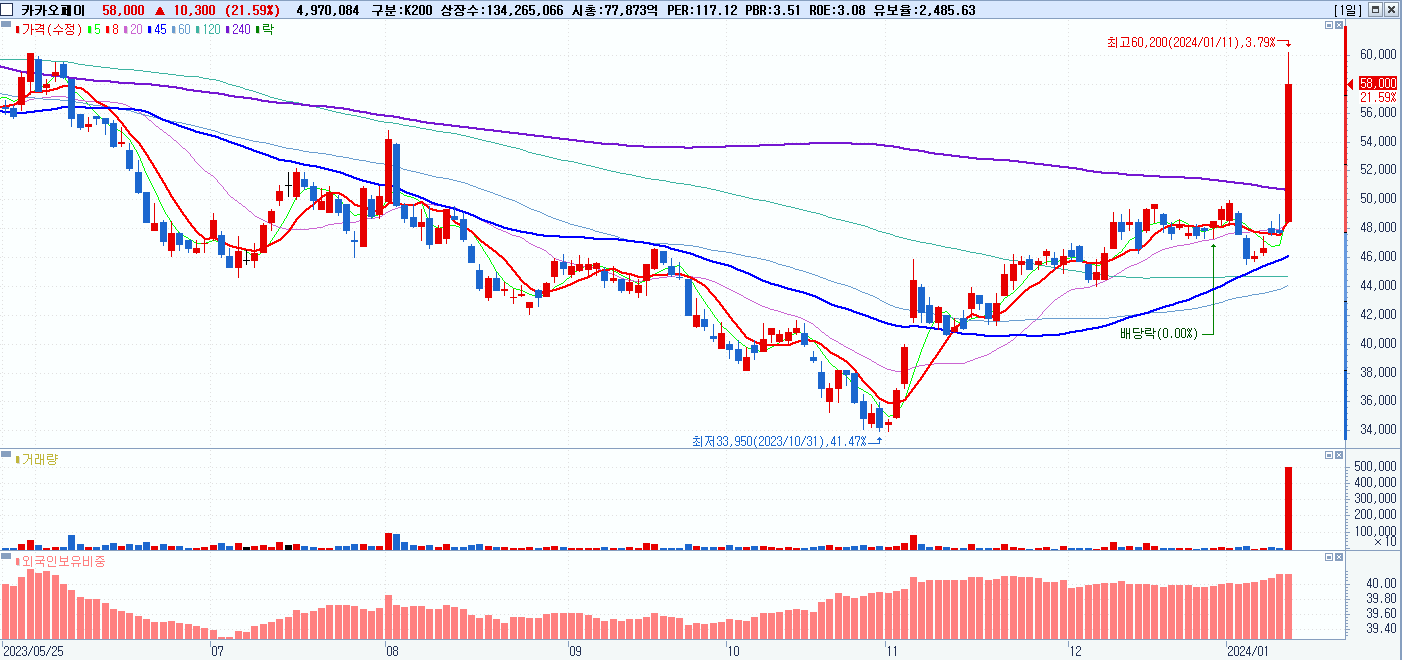 - 카카오페이 (58,000원 ▲ 21.59% , 시총: 77,874억, 거래량: 5,043,844, 거래대금:2,857억)