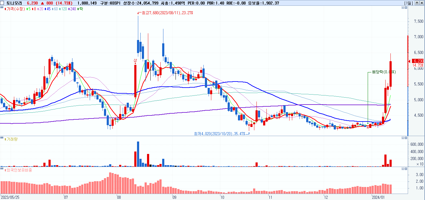 - 토니모리 (6,230원 ▲ 14.73% , 시총: 1,499억, 거래량: 1,889,564, 거래대금:112억)