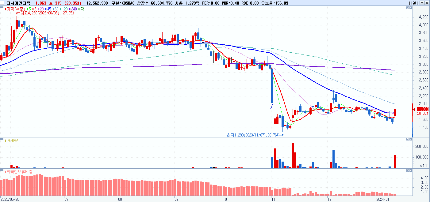 - 티사이언티픽 (1,863원 ▲ 20.35% , 시총: 1,280억, 거래량: 12,671,106, 거래대금:235억)