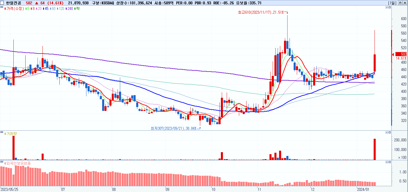 - 한일진공 (502원 ▲ 14.61% , 시총: 509억, 거래량: 22,316,431, 거래대금:124억)