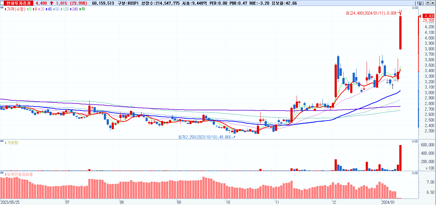 - 한화투자증권 (4,400원 ▲ 29.99% , 시총: 9,440억, 거래량: 60,168,891, 거래대금:2,521억)