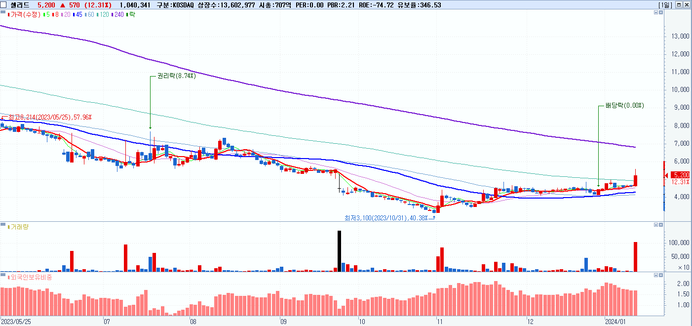 - 셀리드 (5,200원 ▲ 12.31% , 시총: 707억, 거래량: 1,041,844, 거래대금:53억)