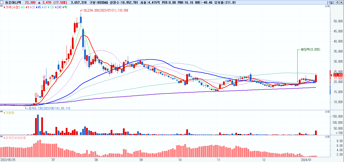 - 동운아나텍 (23,300원 ▲ 17.5% , 시총: 4,416억, 거래량: 3,696,035, 거래대금:845억)