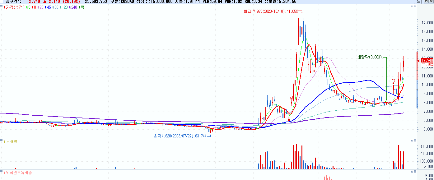 - 흥구석유 (12,740원 ▲ 20.19% , 시총: 1,911억, 거래량: 23,695,453, 거래대금:2,945억)