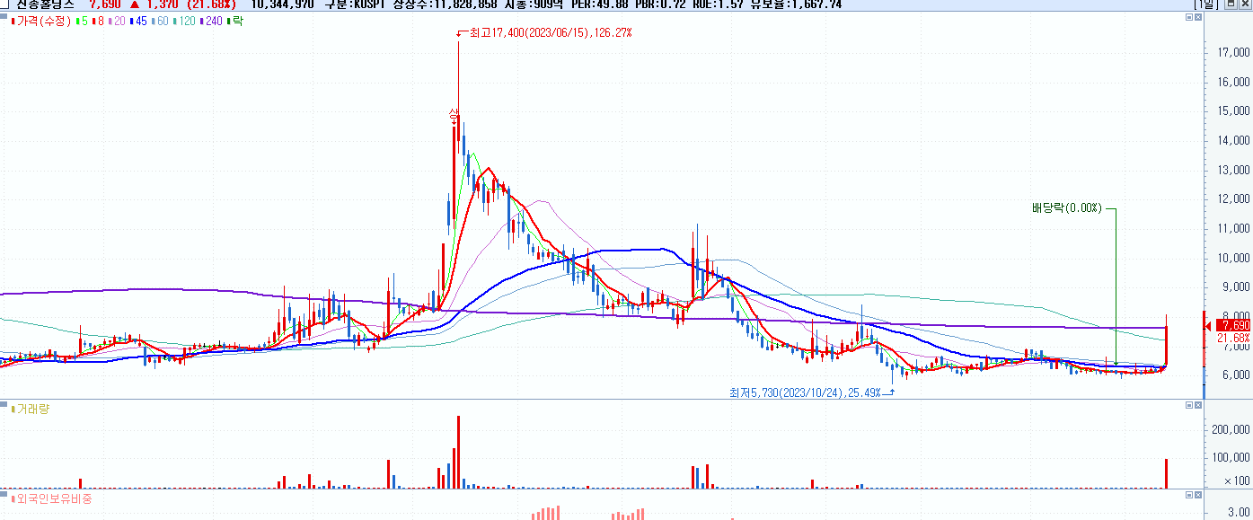 - 신송홀딩스 (7,690원 ▲ 21.68% , 시총: 910억, 거래량: 10,347,559, 거래대금:779억)