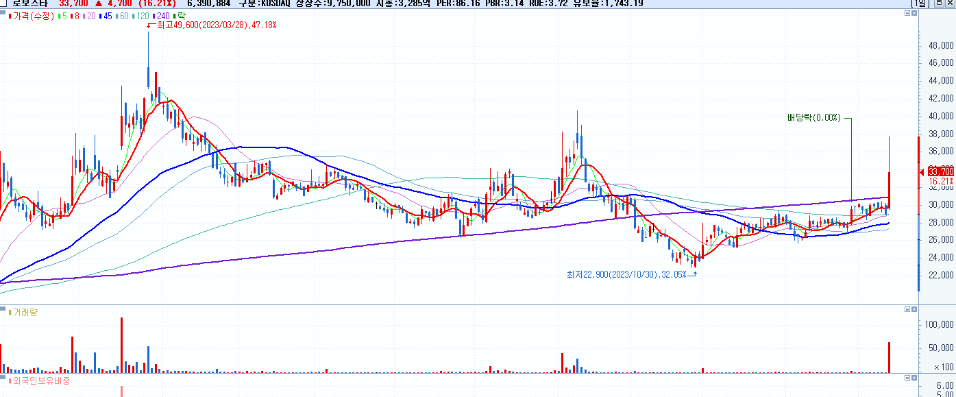 - 로보스타 (33,700원 ▲ 16.21% , 시총: 3,286억, 거래량: 6,392,691, 거래대금:2,250억)