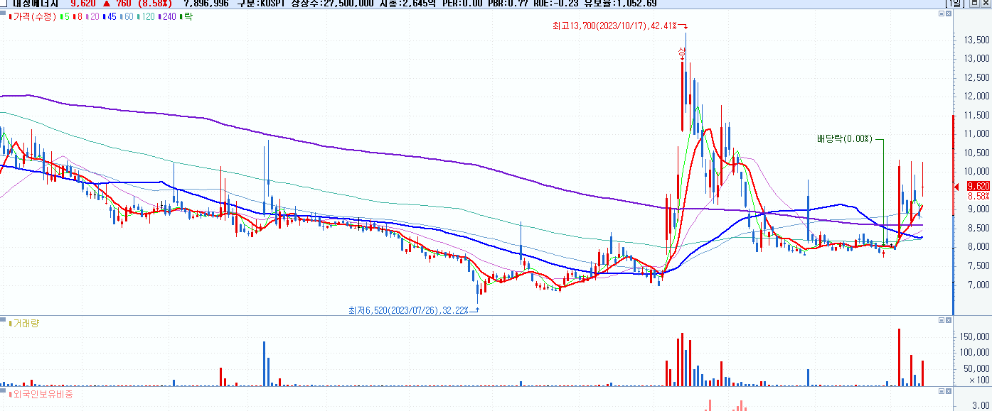 - 대성에너지 (9,620원 ▲ 8.58% , 시총: 2,646억, 거래량: 7,903,281, 거래대금:778억)