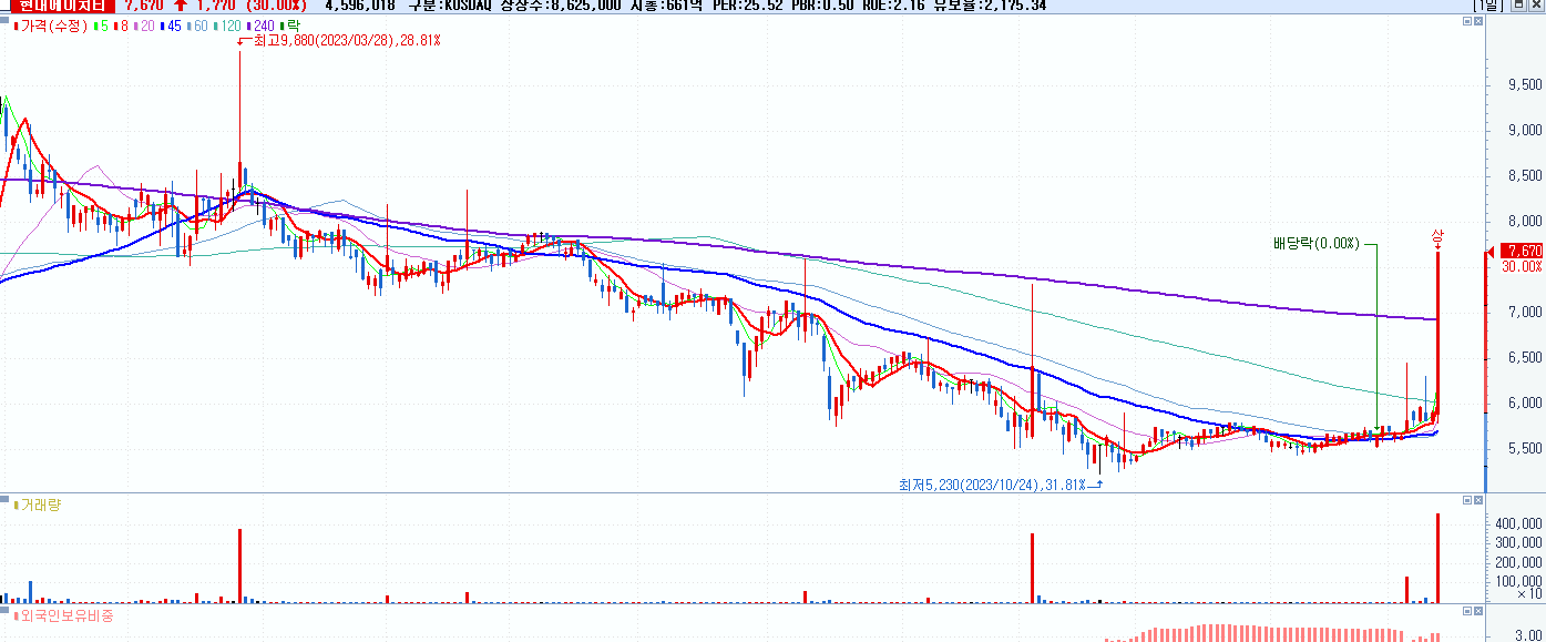 - 현대에이치티 (7,670원 ▲ 30% , 시총: 662억, 거래량: 4,600,875, 거래대금:332억)