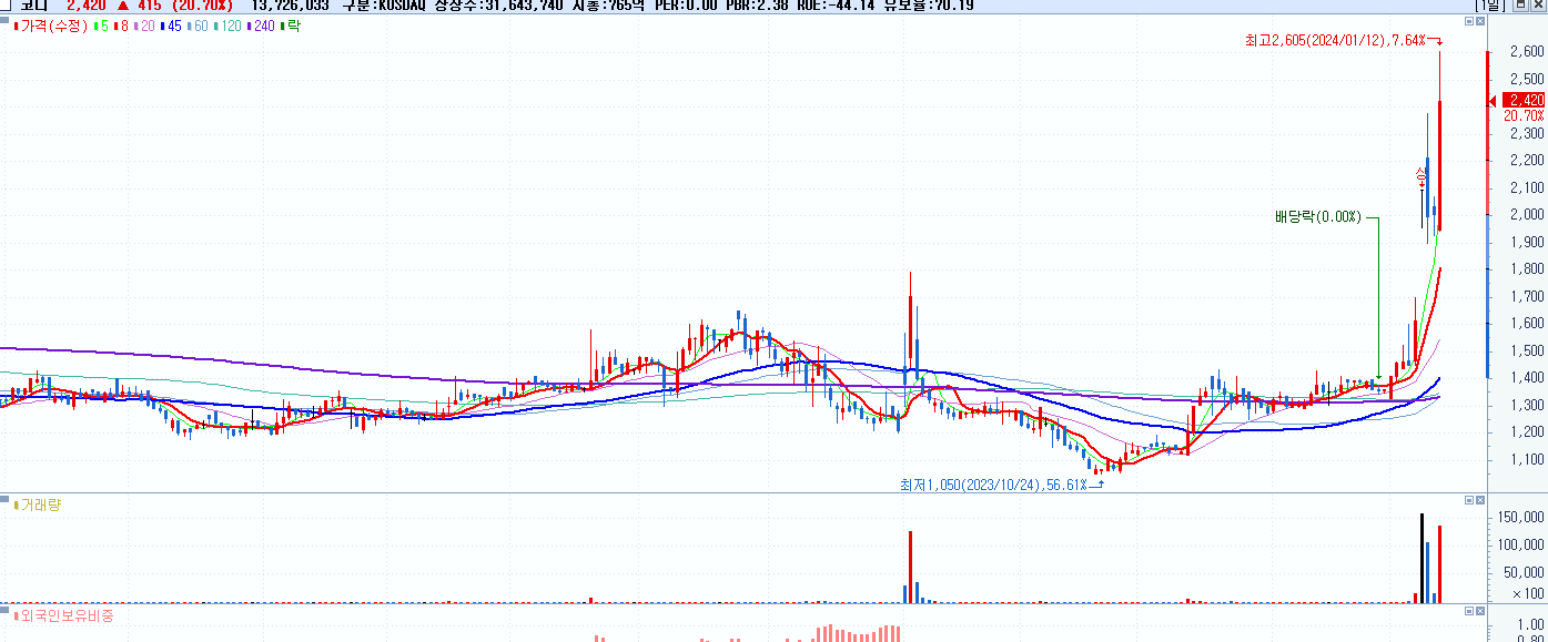 - 코디 (2,420원 ▲ 20.7% , 시총: 766억, 거래량: 13,740,112, 거래대금:326억)